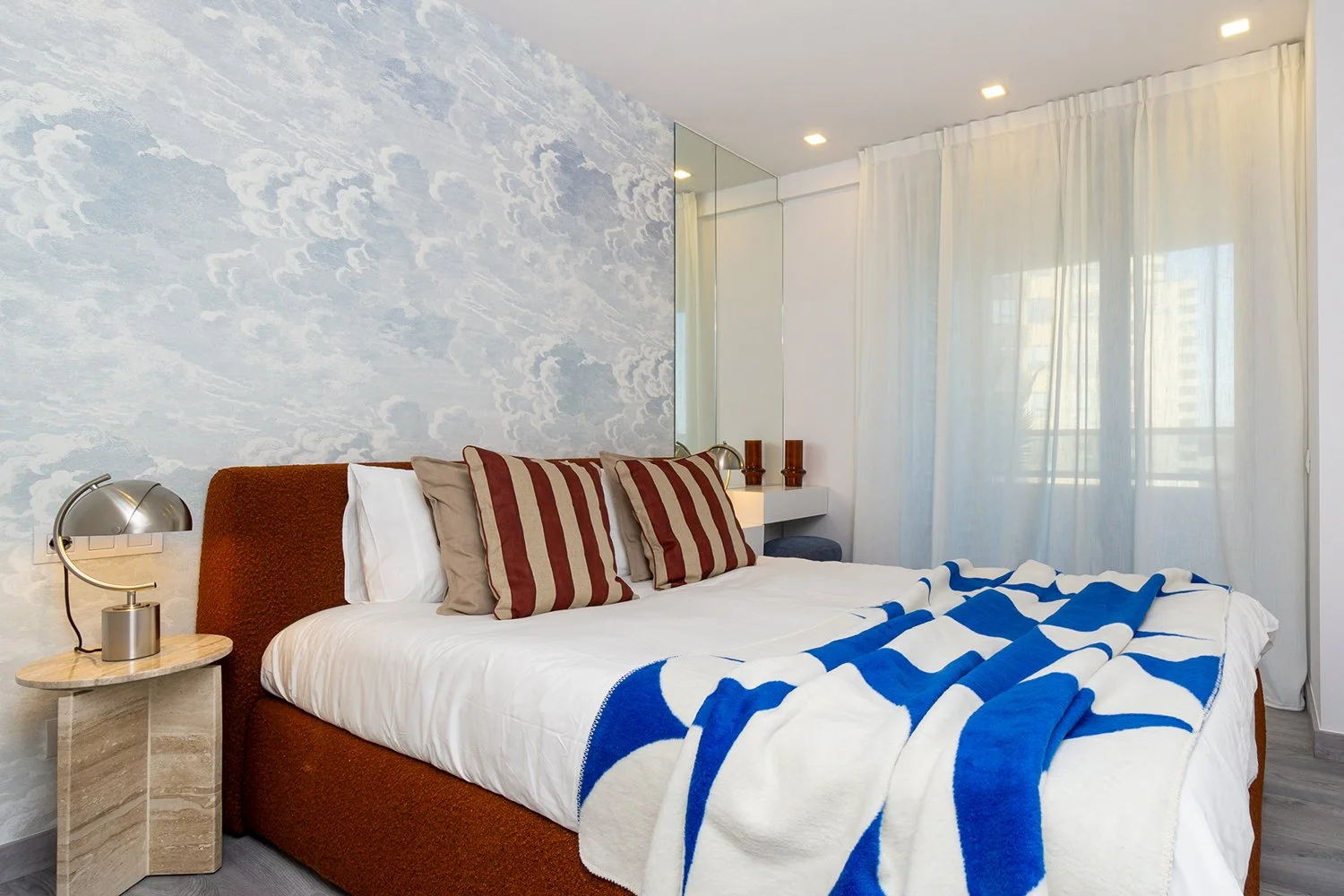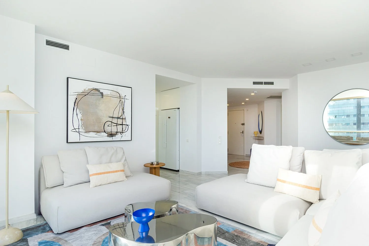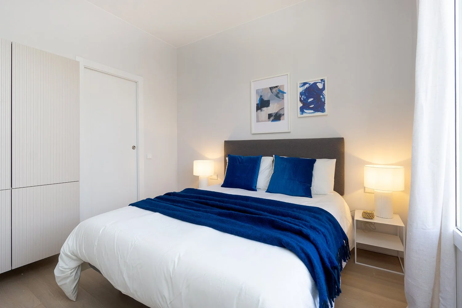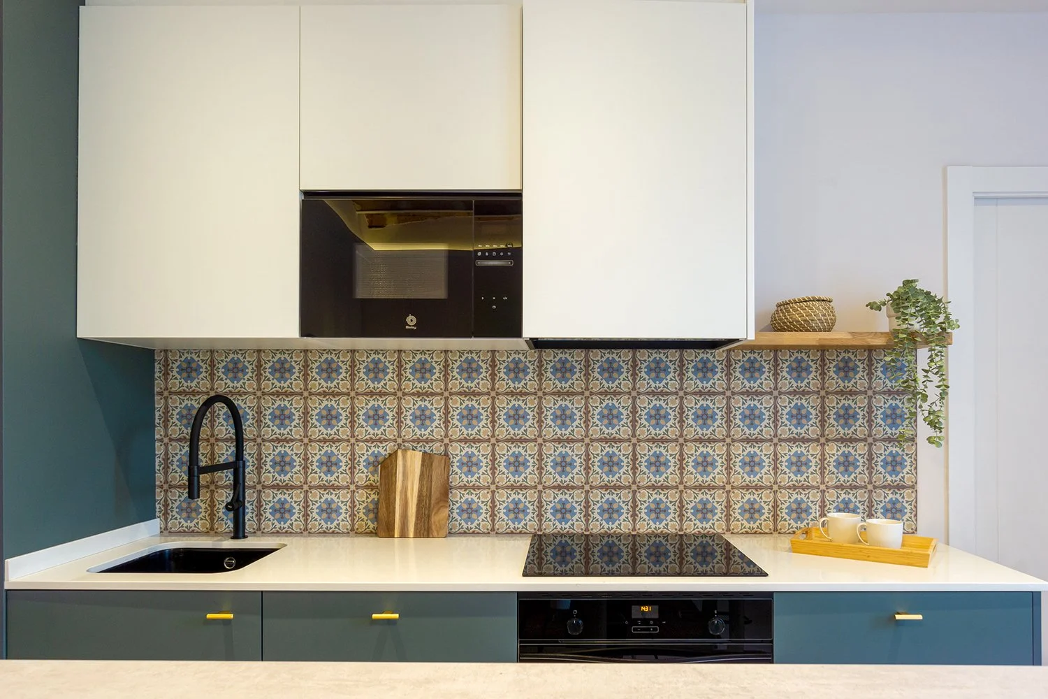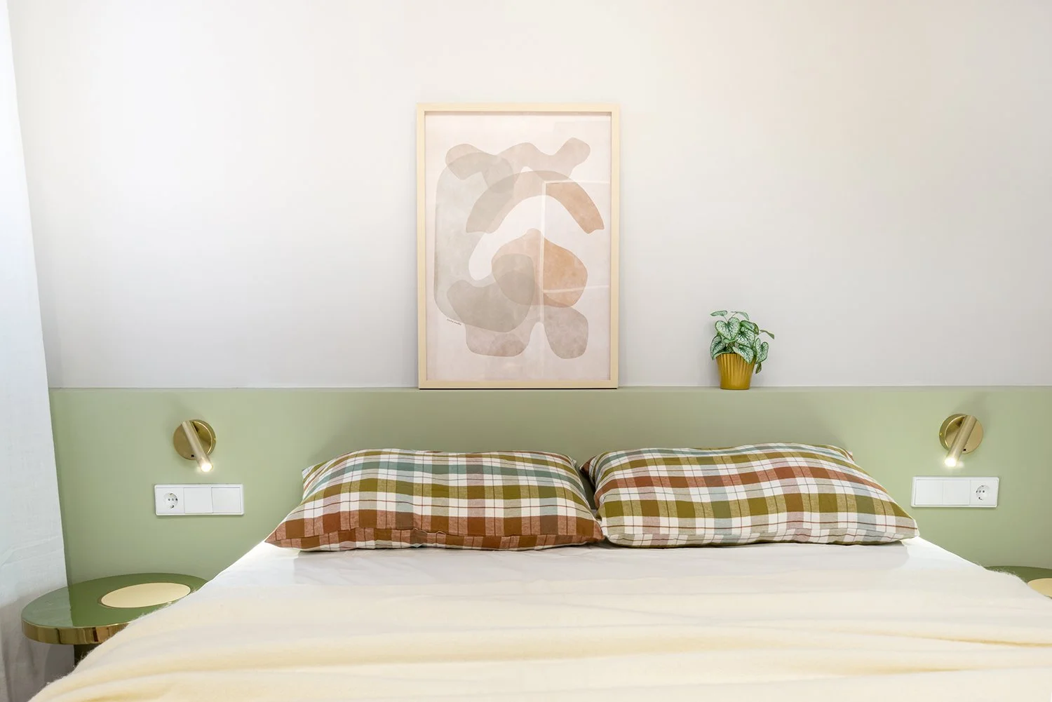 Reforma completa de un piso con tres habitaciones en suite, diseñado para el mercado de alquiler temporal. La cocina con barra abierta al salón crea un espacio social y funcional, mientras que los colores y formas modernas aportan carácter y atractivo visual. Un proyecto pensado para destacar por su estilo y comodidad.